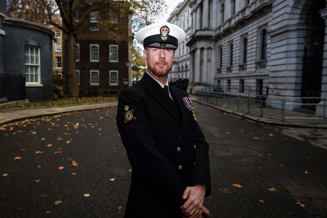 In my day to day work, I take many “official portraits” of senior Naval officers and the process is very rigid. The lights are always at a 1:4 ratio and one of three set poses is chosen. I have actually completed exams in this and there are crib cards with the poses and lighting setup in every military photographic section across the land. We are instructed to use the same background, same poses, same flag placement. The flag in this example is actually wrong, it’s supposed to disappear behind the leg. This is not what I wanted for this project, I wanted to be in ceremonial uniform, but I didn’t want it to be an official portrait, I chose a different more relaxed pose, different light setup and made it an in-situ portrait. I think these subtle changes have a big effect on the final image.